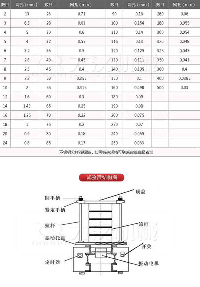 另外:國家標準中的試驗篩120# 以上的篩子是用銅編織的,如果您需要不銹鋼材質的需要特殊說明。