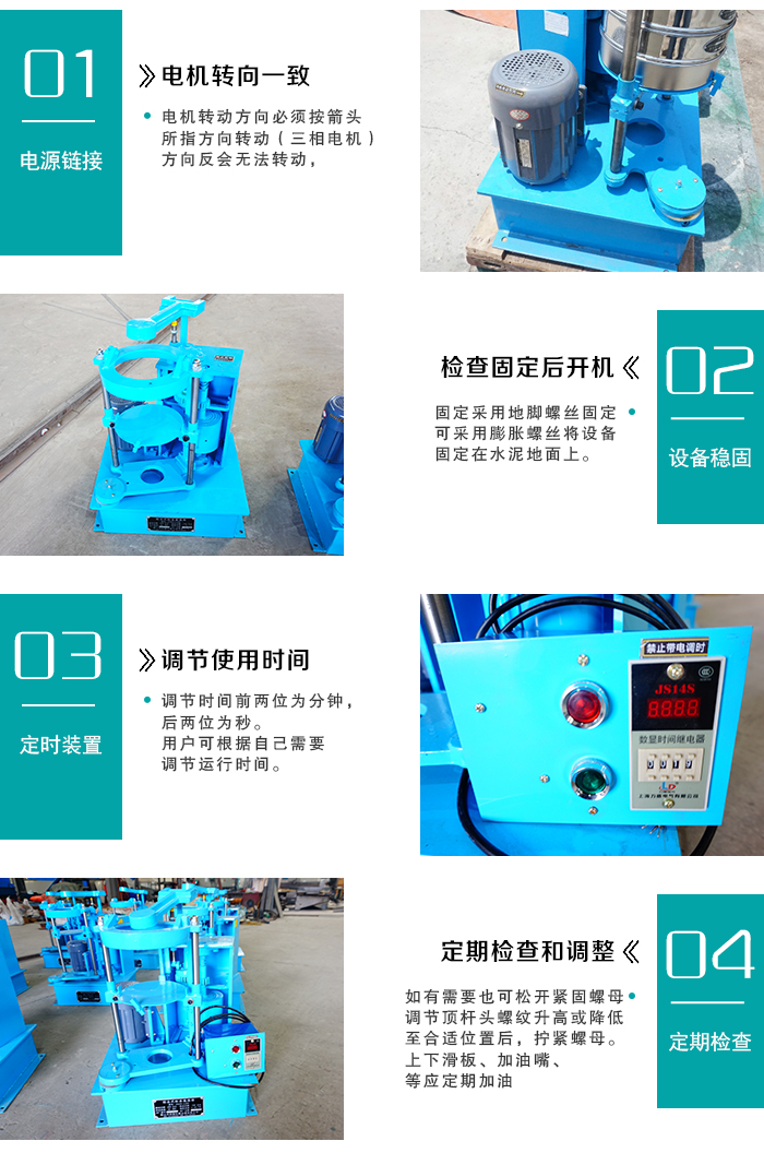 3.安裝試驗(yàn)篩:松開托盤緊固螺絲,將托盤向下移動(dòng),裝入裝好物料的試驗(yàn)篩(分樣篩、標(biāo)準(zhǔn)篩),然后托起托盤至合適位置,擰緊緊固螺絲,蓋好翻蓋,放下錘鐵后,定好時(shí)間即可開機(jī)。采用100、75夾具可使用相應(yīng)尺寸套篩,特殊尺寸可定制。