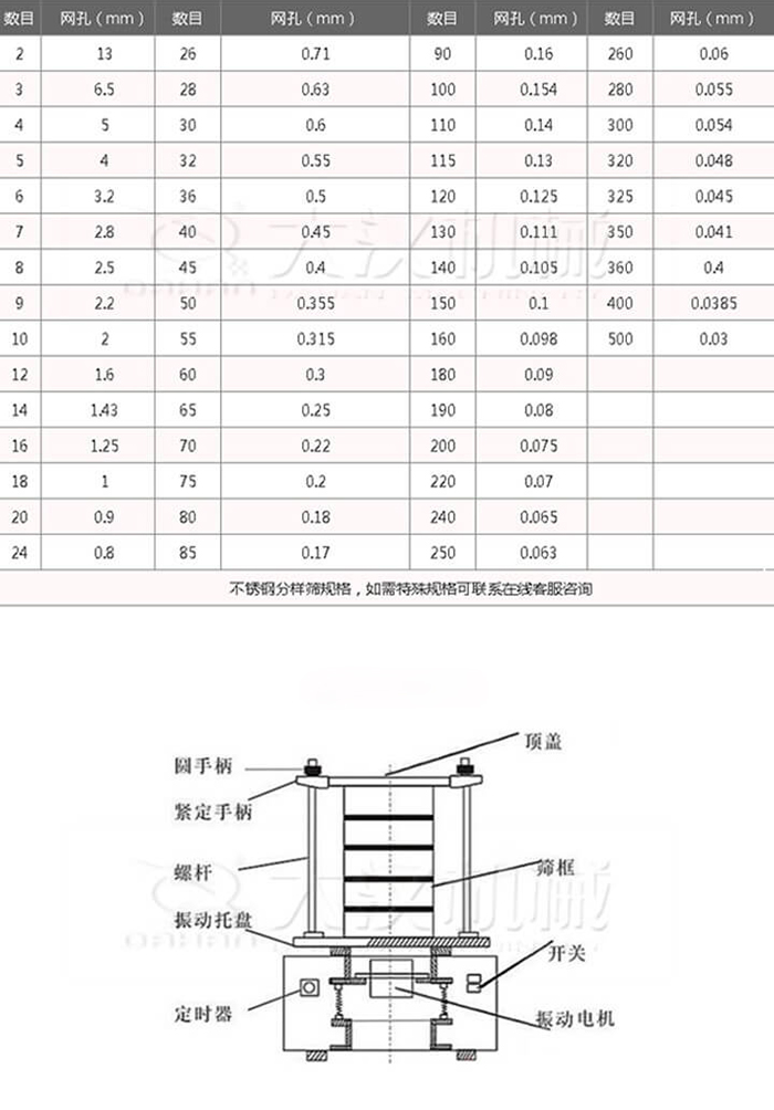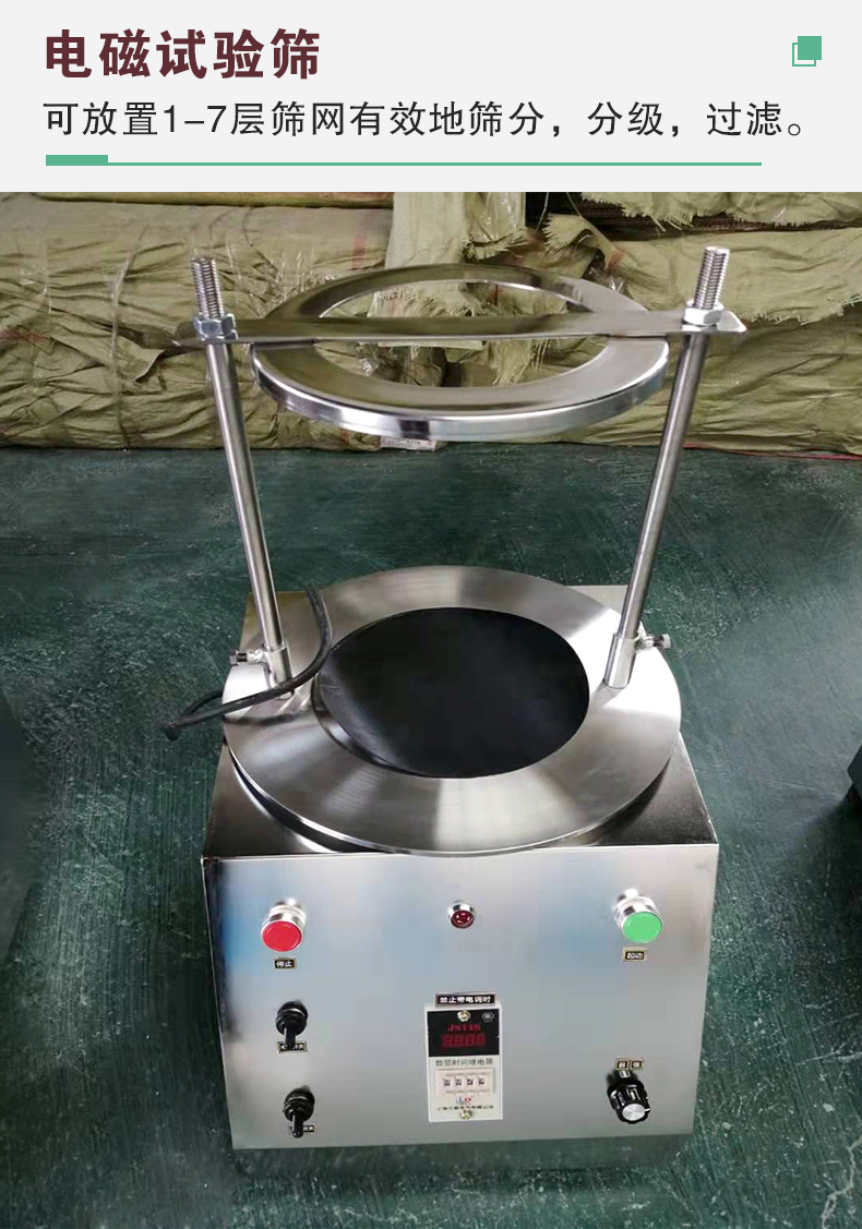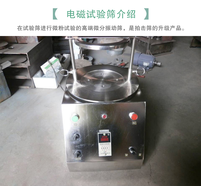 電磁式標準篩可放置1-7層試驗篩,使試驗篩中的物料能有效地篩分,分級,過濾。由于篩面能高頻上下顫動,使物料能從網(wǎng)孔中甩出,物料很少粘網(wǎng),提高了細物料的篩分效率,干篩正常使用,能篩分至20um(635目):增加我公司設(shè)計的負壓裝置,能干篩篩分物料5um。解決了超細微粉干篩的難題。
