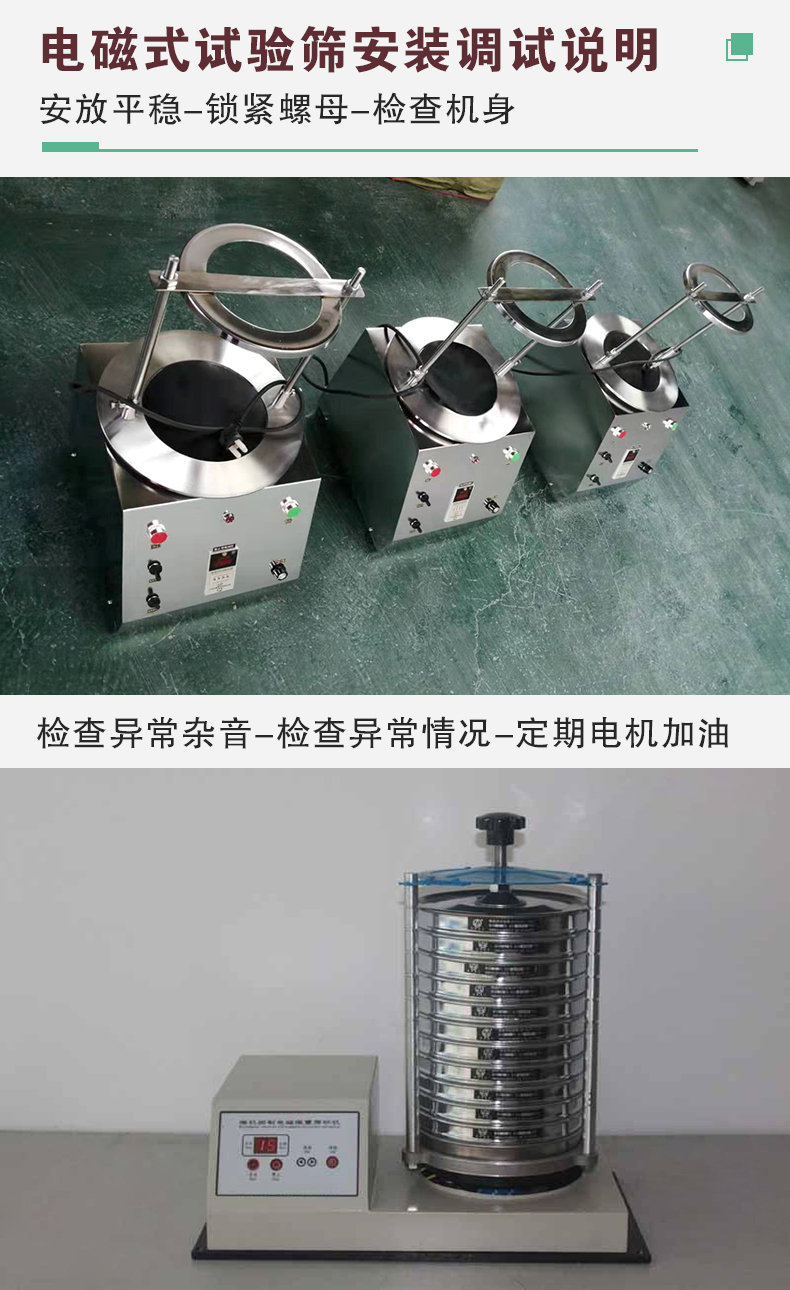 電磁式實驗篩是以電磁振動器作為振動源,電磁振動器振動帶動篩機底座振動,再通過底座傳導(dǎo)到安放在底座的一套從粗到細排列的標準試驗篩,上下高頻顫動,同時安裝在下部的振動電機使物料攤開。物料在標準檢驗篩篩面上振動,使小于試驗篩篩面網(wǎng)孔的物料顆粒篩分進下層試驗篩,如此層層篩選,使每層試驗篩內(nèi)只留相同顆粒的物料,達到不同粒度的分離并確定此物料的粒度組成。
